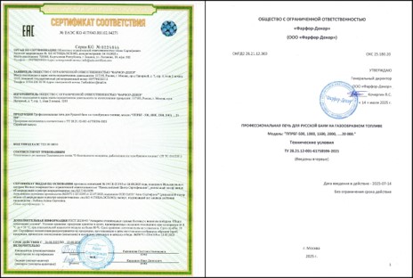 Параллельно с патентованием, мы на все свои печи разработали Технические паспорта, ТУ (в зависимости от способа нагрева) и получили Сертификаты и Декларации (подтверждающие качество, безопасность и соответствие Техническому регламенту).