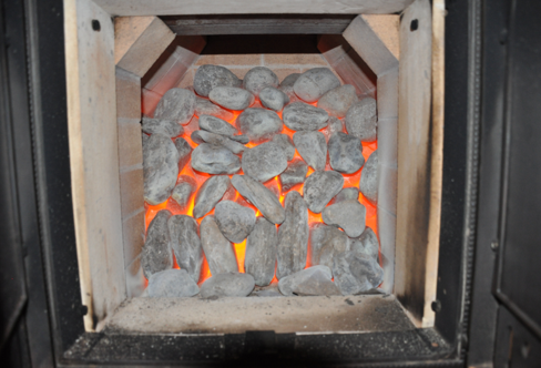 На первых этапах горения, на камнях накапливается сажа, по мере увеличения температуры заряда до 600 - 700 градусов в верхних слоях загрузки и около 1000 градусов в нижних и центральных слоях, сажа полностью выгорает.